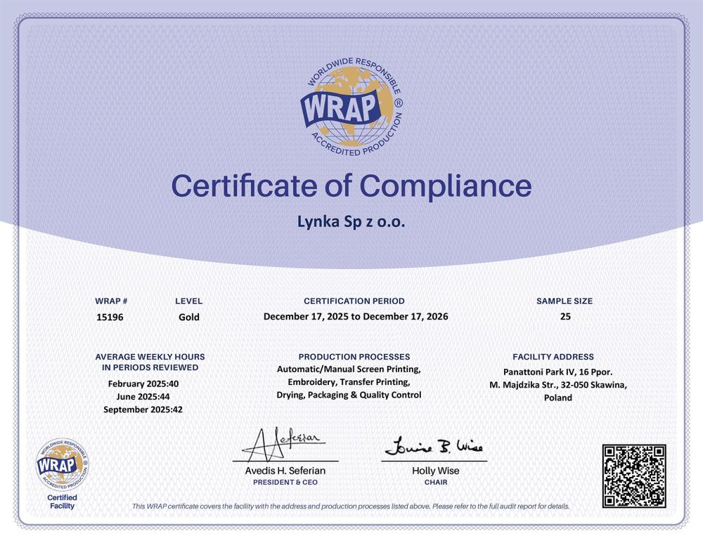 We are pleased to announce that on December 17, 2025, Lynka was re-certified with a Gold Certificate of Compliance by WRAP, the Worldwide Responsible Accredited Production's Certification Board.